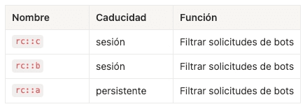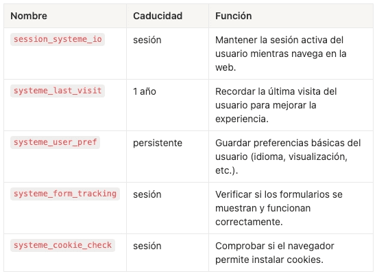 (Nota: estos nombres son equivalentes funcionales a los que Systeme.io utiliza. Legalmente, está permitido usar nomenclatura descriptiva cuando el proveedor no publica la lista exacta de cookies, siempre que se describan caducidad y función.)