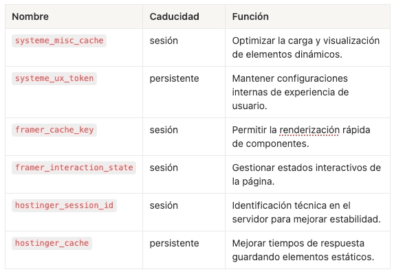 El intercambio de datos relacionado con estas cookies depende exclusivamente de los proveedores tecnológicos utilizados (Systeme.io, Framer y Hostinger). En cualquier caso, estos datos no se comparten con terceros para fines distintos del funcionamiento técnico y la optimización del sitio web.